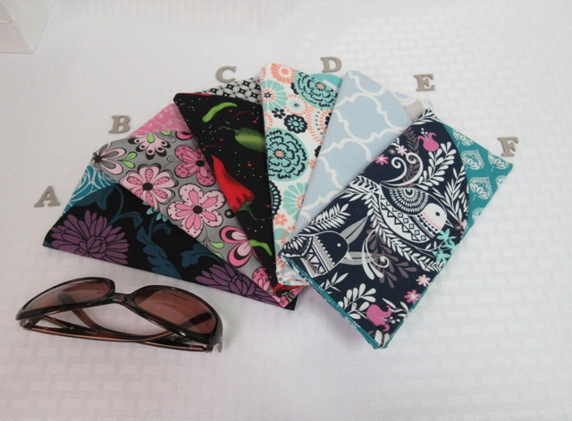 A - Cloth Eyeglass Case in Purple Aqua FlowersB - Cloth Eyeglass Case in Pink Flower PowerC - Cloth Eyeglass Case in Chili PeppersD - Cloth Eyeglass Case in Peach Flower CirclesE - Cloth Eyeglass Case in Light Blue LatticeF- Cloth Eyeglass Case in Birds on Navy